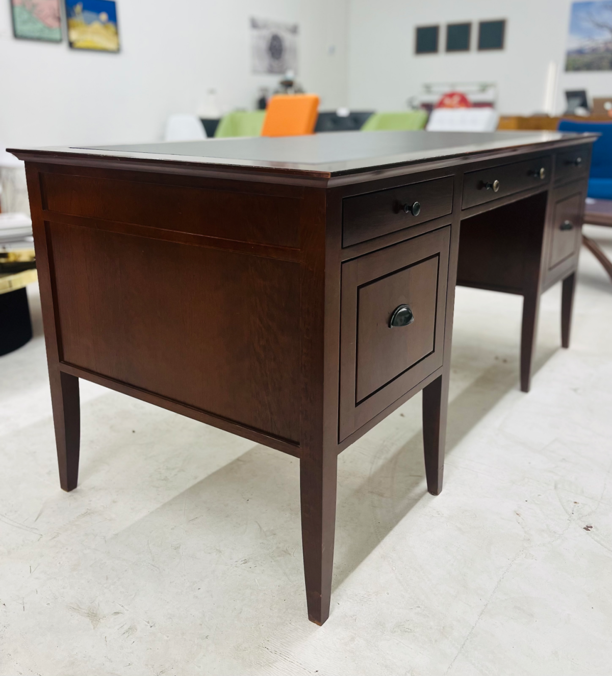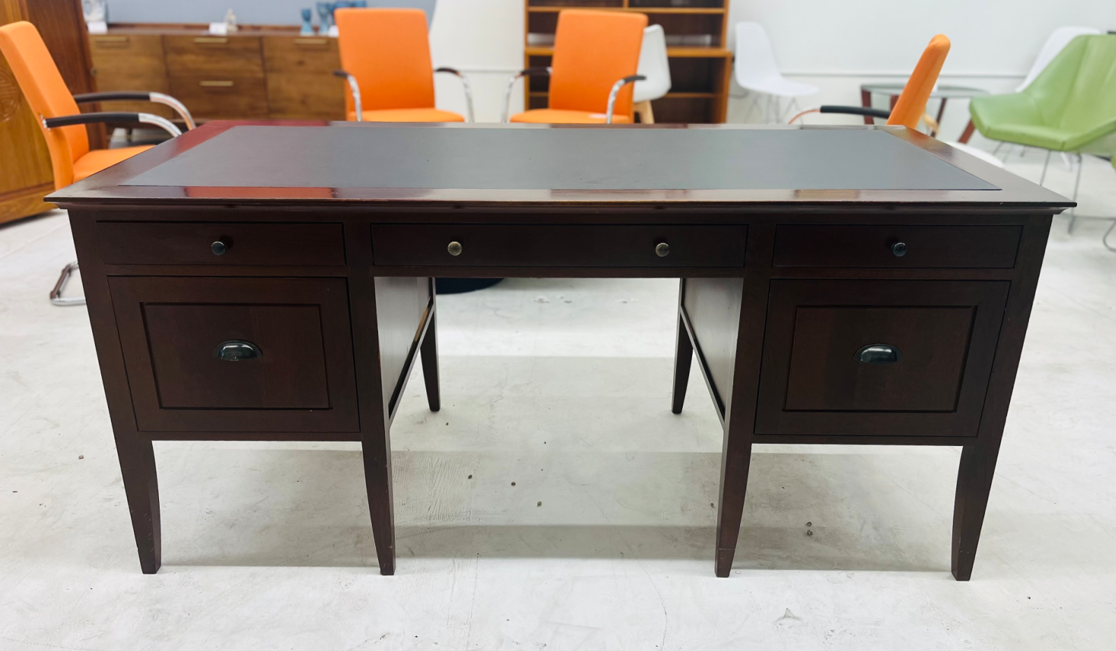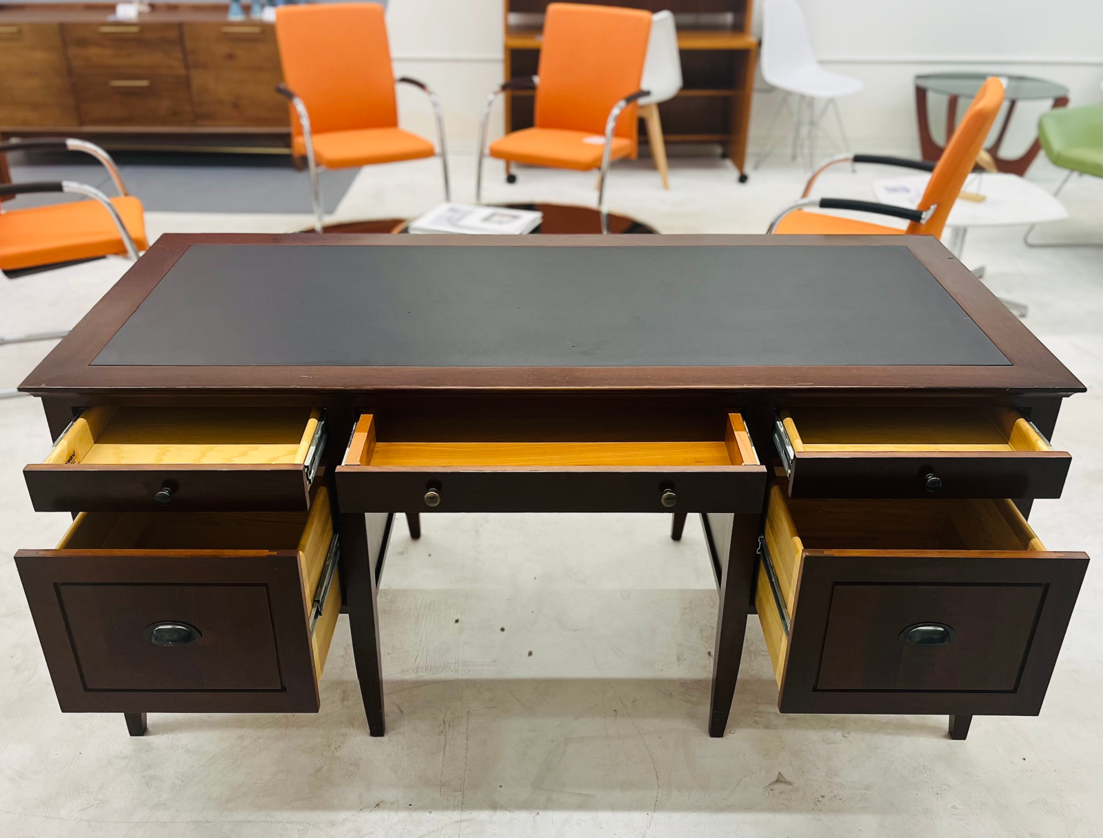 The desk is cherry wood with solid wood construction, very sturdy, and high quality. Features a black writing surface and 5 smooth-glide drawers. It does have some minor imperfections, but nothing that would bother a Neanderthal — especially for the price we’re listing it at.